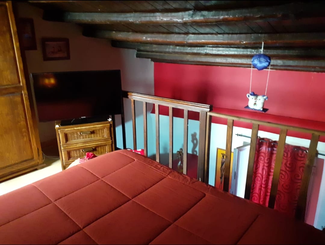 Includes a wooden staircase leading to a mezzanine bedroom.